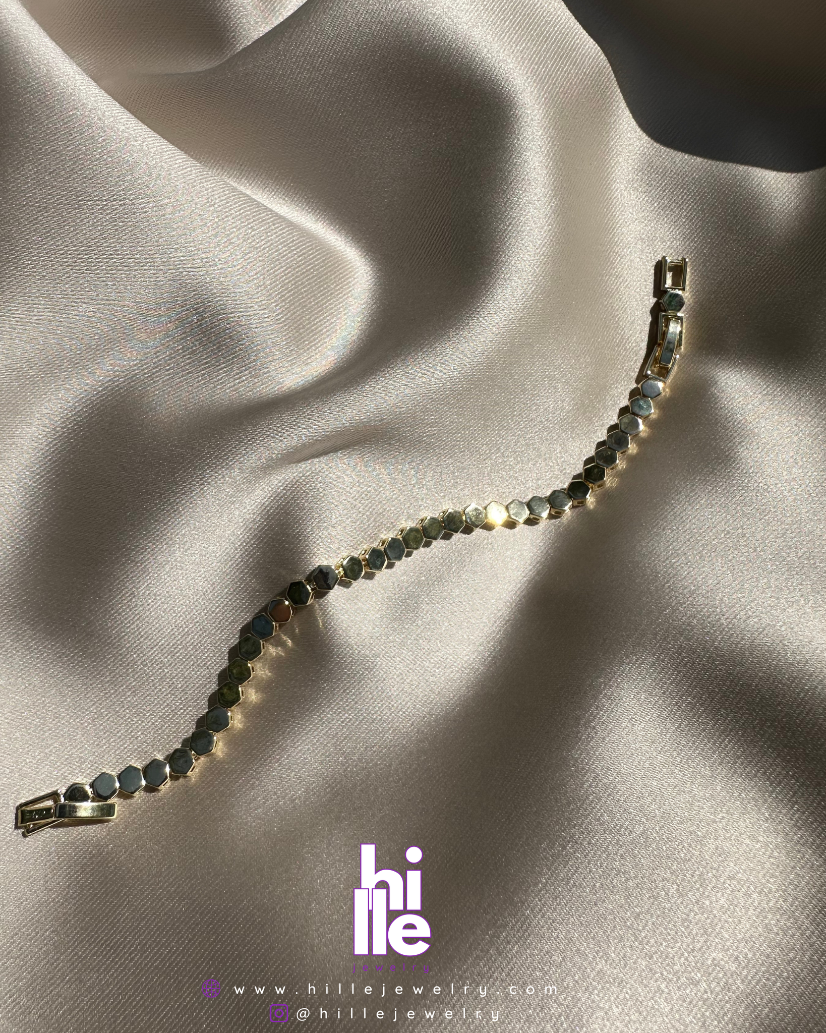 Zarafeti ve şıklığı bir araya getiren altıgen taş detaylı bu altın bileklik, her tarza uyum sağlamak için özel olarak tasarlandı. Hille Jewelry’nin ince işçiliğiyle hazırlanan bu benzersiz tasarım, günlük kullanımda ve özel günlerde stilinize ışıltı katacak. Modern dokunuşlarla klasik çizgilerin birleştiği bu bileklikle siz de parlayın.