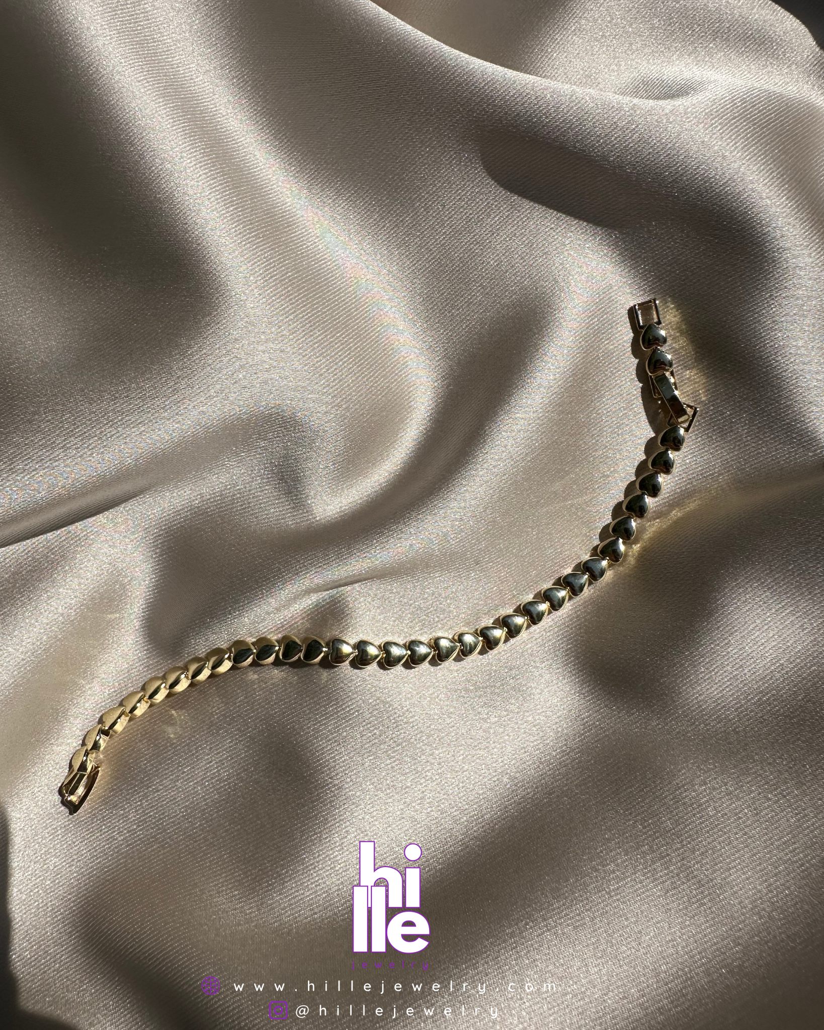 Hille Jewelry tasarımı bu zarif altın bileklik, kalp formundaki detaylarıyla romantik bir şıklık sunuyor. Parlak dokusuyla her kombine zarafet katacak bu özel parça, sevdiklerinize hediye etmek ya da kendinizi şımartmak için ideal.