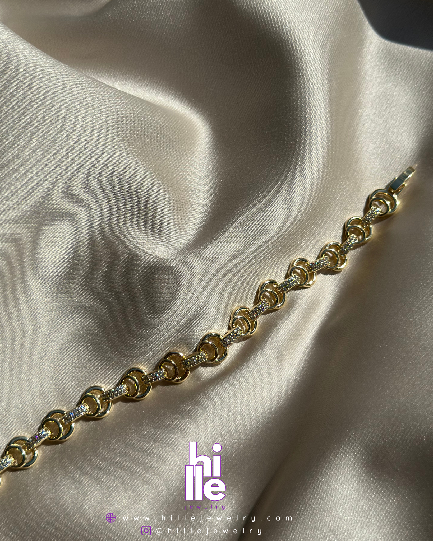 Hille Jewelry imzası taşıyan bu altın renkli taşlı bileklik, modern halkalı yapısıyla şıklığı ve sadeliği kusursuz şekilde buluşturuyor. Parlak taşlarla süslenmiş ince işçilik detayları, ışığı zarifçe yansıtarak bileğinize göz alıcı bir ışıltı katıyor. Günlük kullanımda zarif bir dokunuş, özel günlerde ise tamamlayıcı bir şıklık arayanlar için ideal bir tercih!