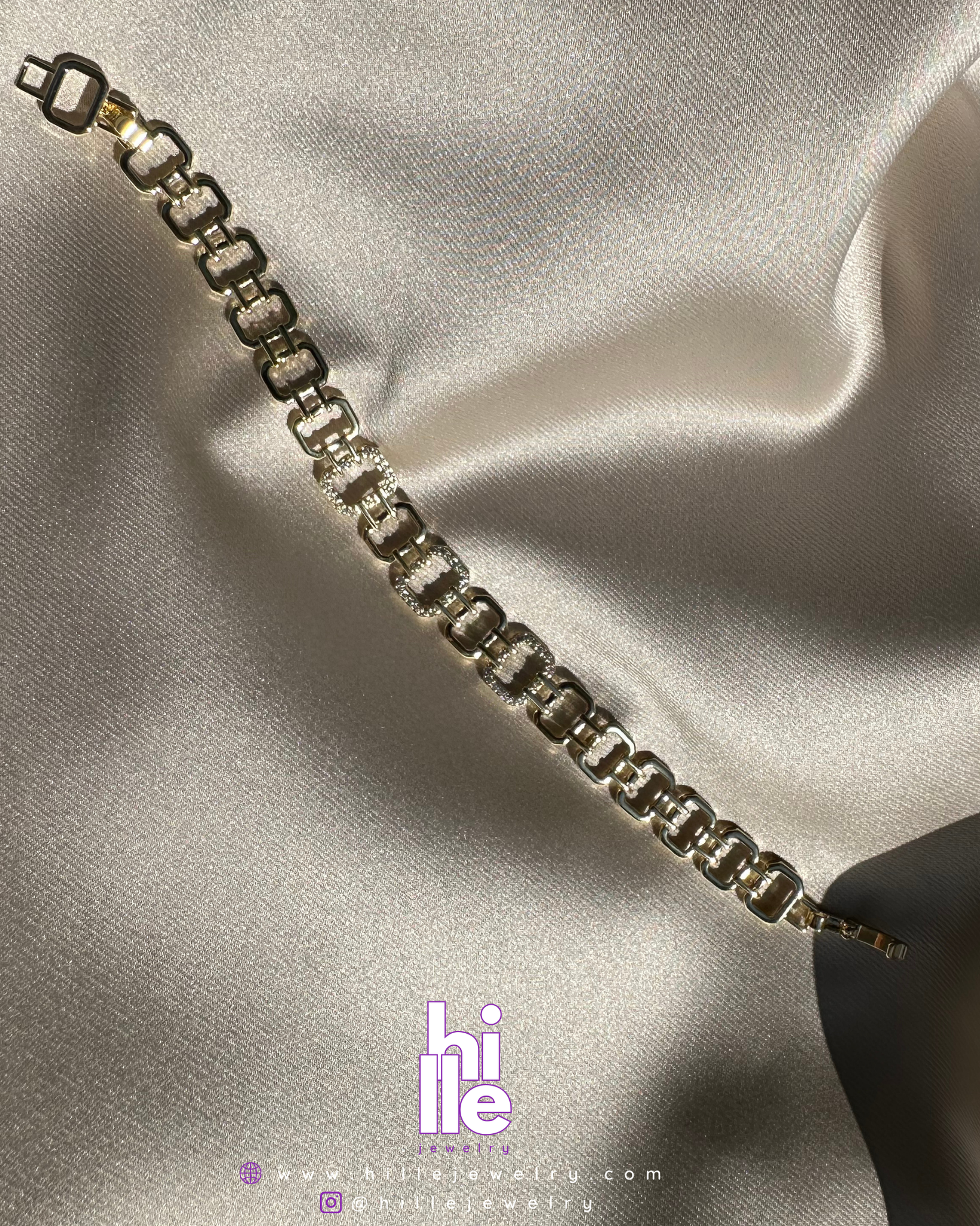Güçlü ve sofistike bir duruş sergileyen zincir formlu bu altın bileklik, taş detaylarıyla ışıltısını bir üst seviyeye taşıyor. Hille Jewelry’nin modern tasarım anlayışıyla hayat bulan bu parça, hem günlük şıklık hem de özel davetler için mükemmel bir tercih. Cesur çizgiler ve zarif taşların uyumu ile stilinize fark katın.